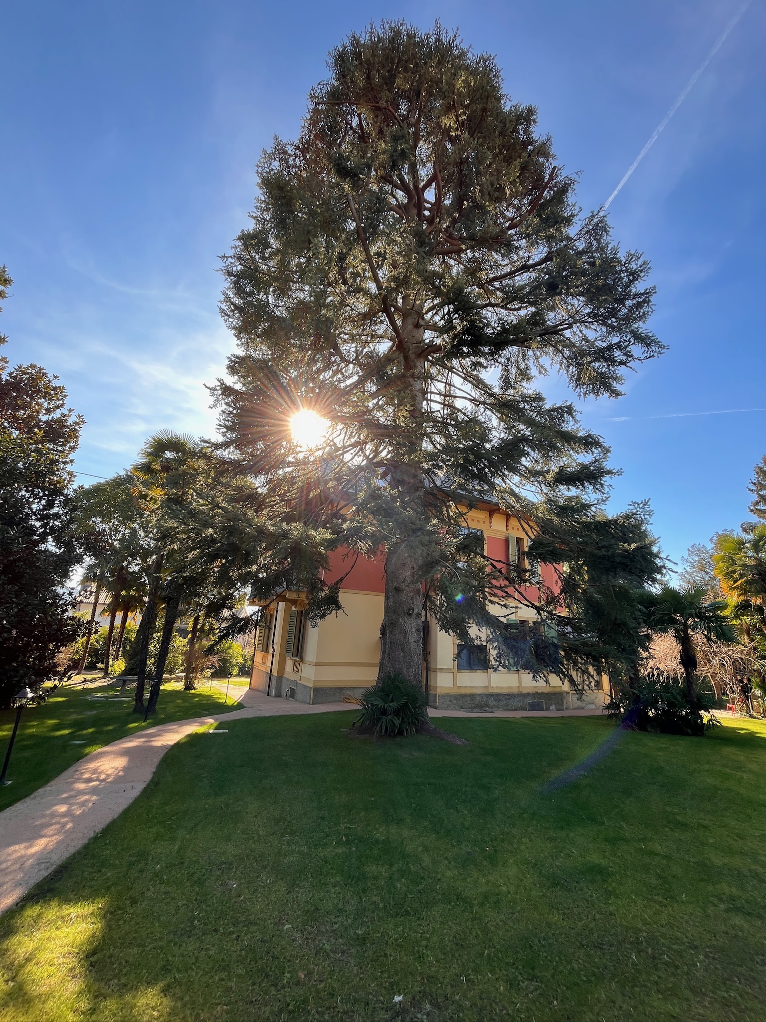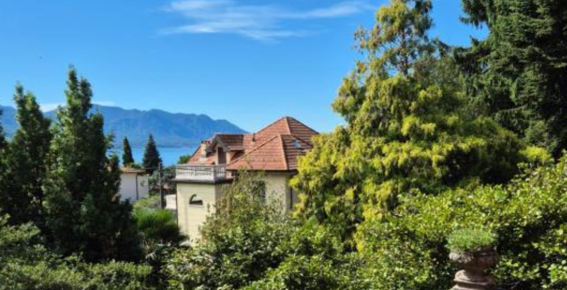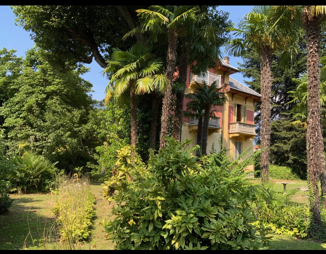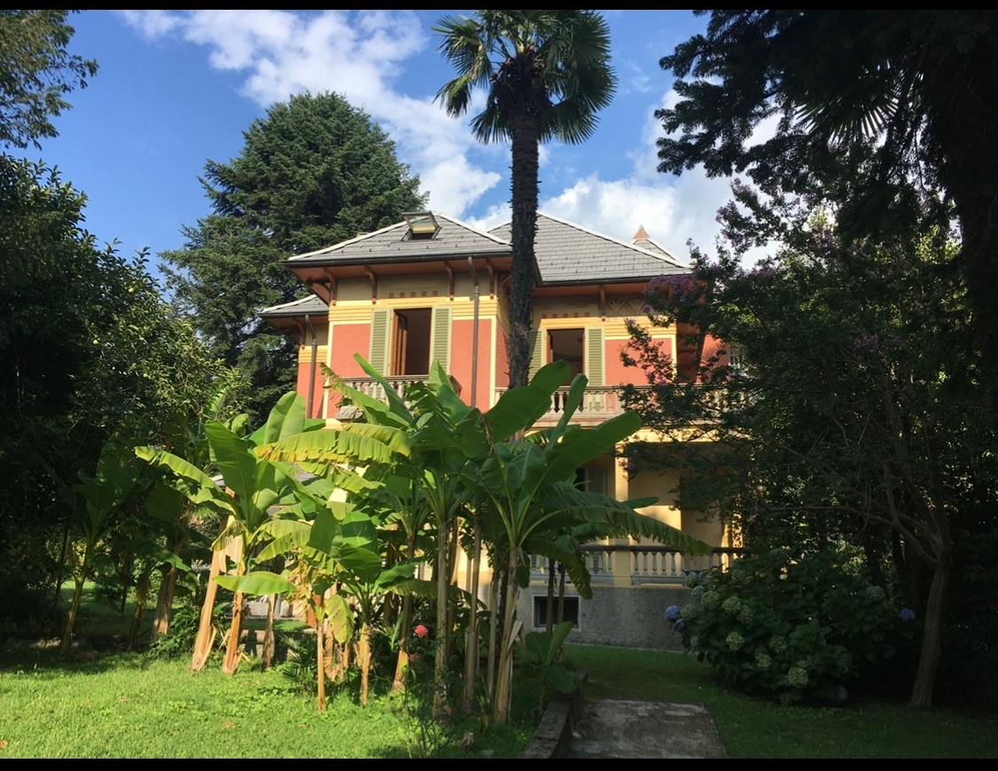 Discover in this photo gallery Villa del Castañar: the elegant Liberty-style villa, the surrounding park, the living room, the dining room and kitchen, the bedrooms with private bathrooms, the terraces, and the views of Lake Maggiore.